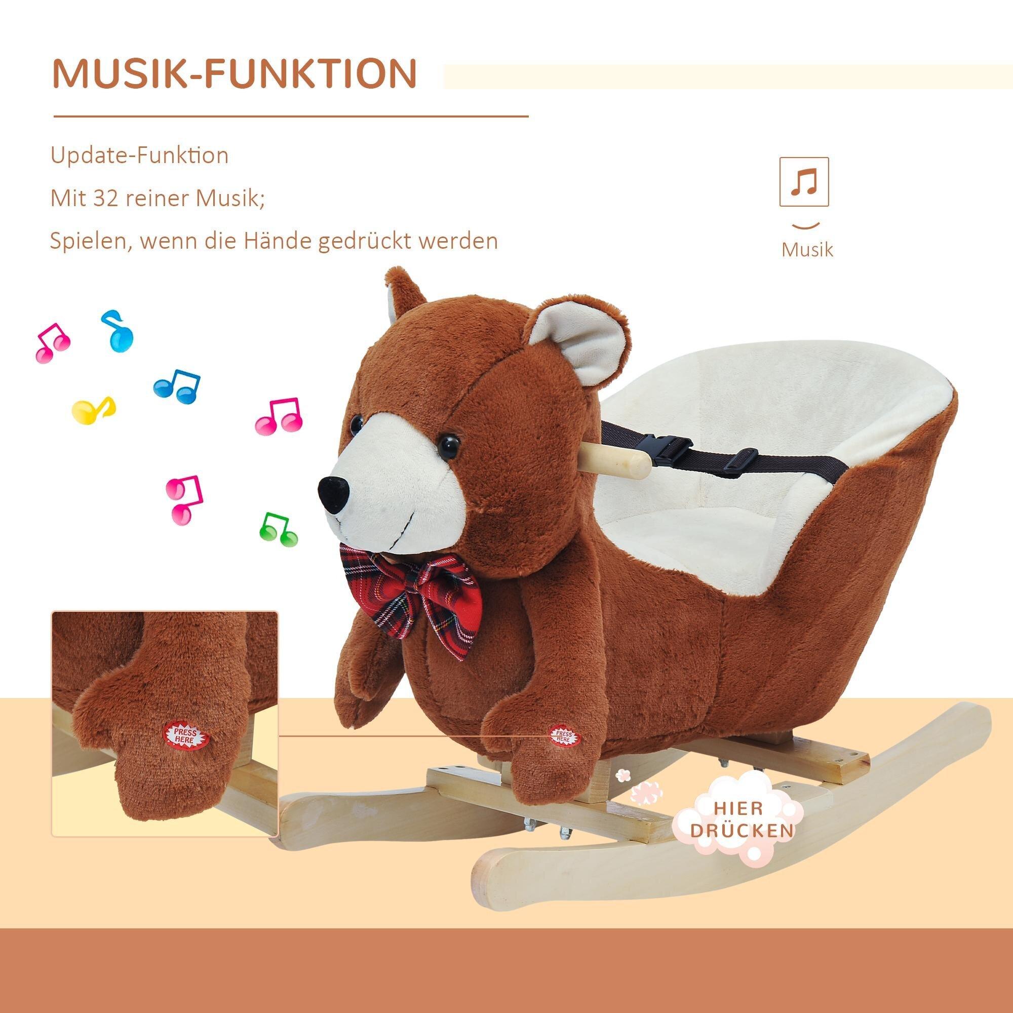 Ge dina nära och kära en orädd följeslagare! Upptäck vår söta nallebjörn! Vår söta vän väntar bara på att få barnens hjärtan att slå snabbare. Din följeslagare för barnrummet är inte bara söt att titta på. Den är också tillverkad av mjuk plysch. Det är inte bara behagligt, utan också skonsamt. Djurets medar är avrundade för ditt barns säkerhet och tillverkade av miljövänligt poppelträ. Fåtöljen är inte bara bekvämt vadderad, utan ger också tillräckligt med stöd. Tack vare säkerhetsbältet sitter ditt barn säkert även under mer turbulenta gungäventyr. Och för att varje resa ska ackompanjeras av musik spelar vår plyschhjälte en av flera barnvisor när man trycker på den. Vår trogna följeslagare väntar bara på dig!